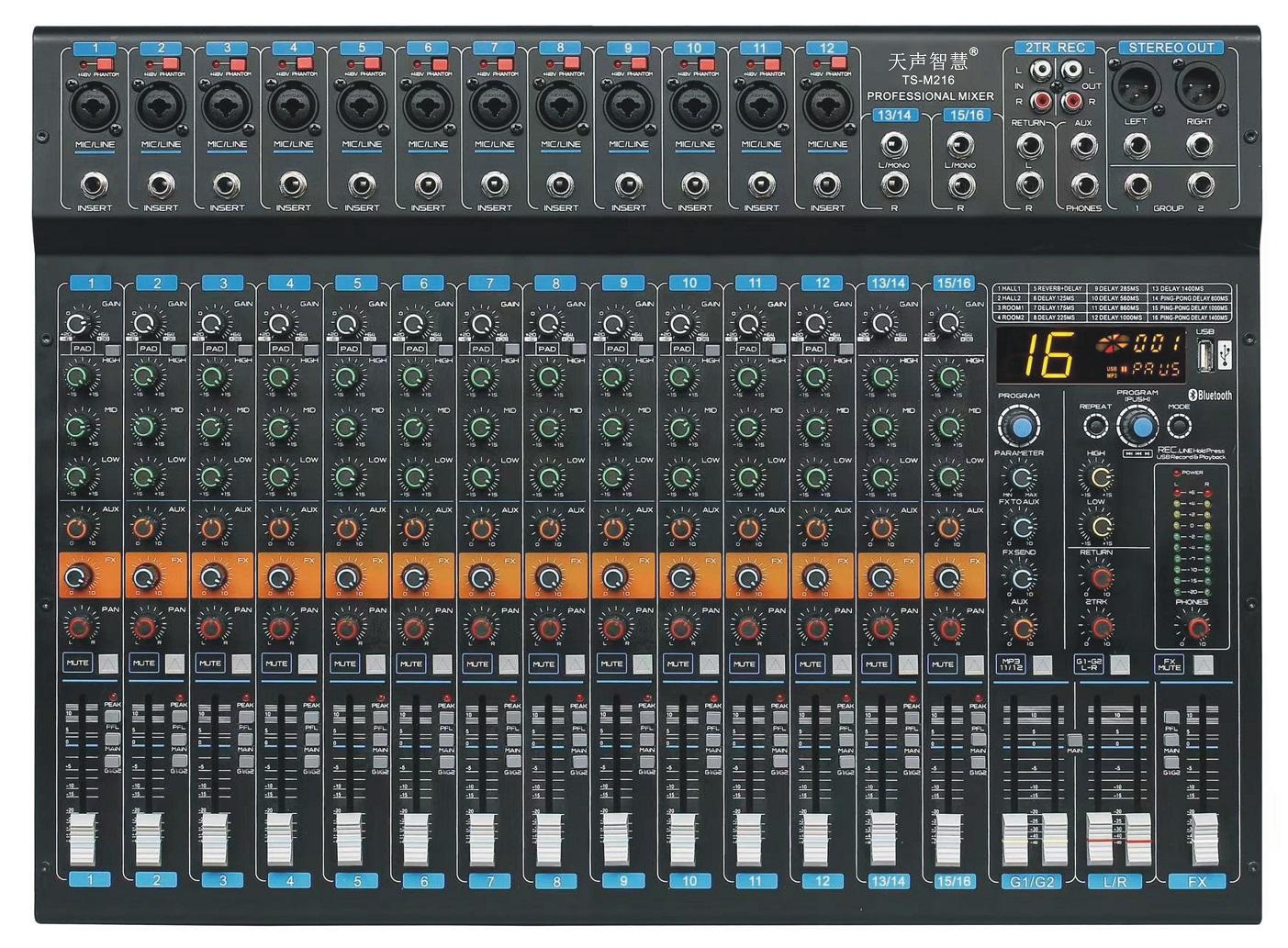 2、十二路Mic输入接口兼容四路线路输入接口;四路单声道6.35平衡输入接口;两路立体声输入接口;
